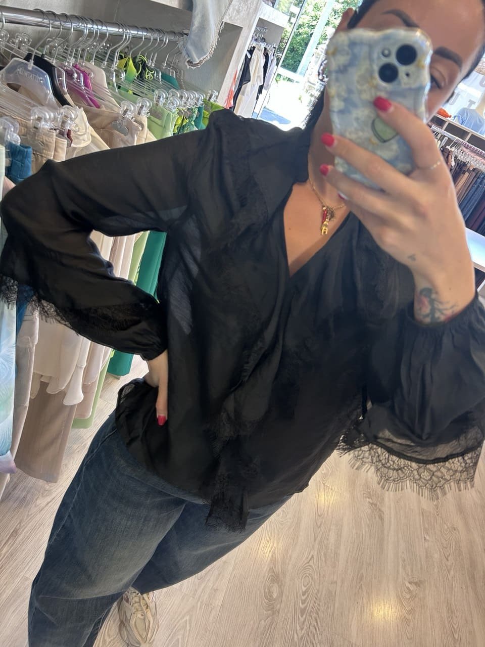 Camicia in mussola di cotone con scollo a V. manica con dettaglio in pizzo e polsino con elastico.