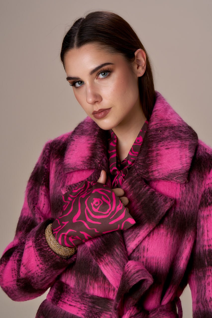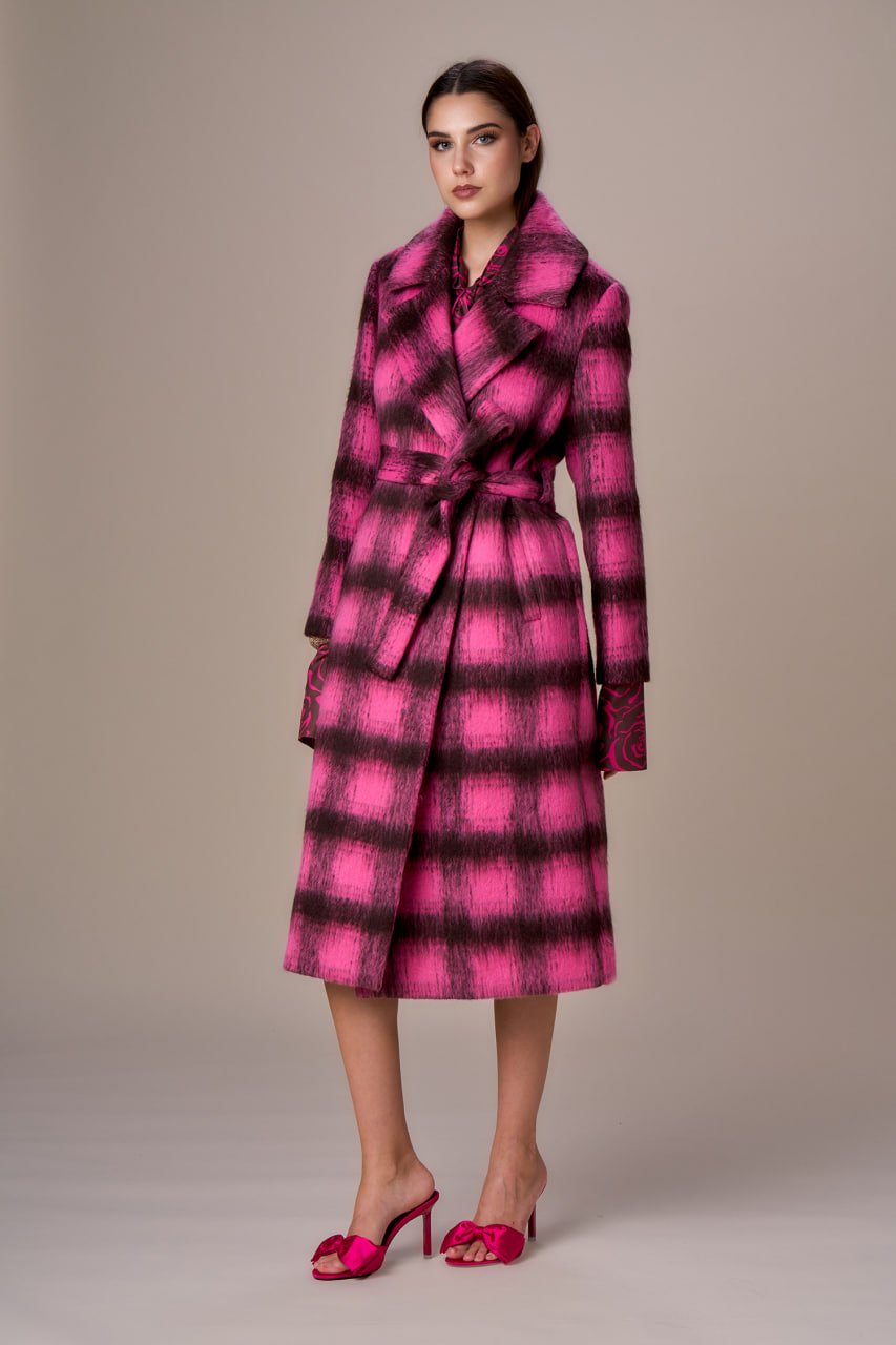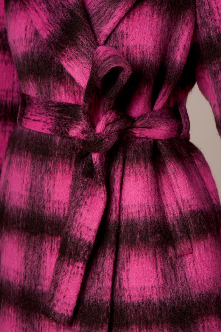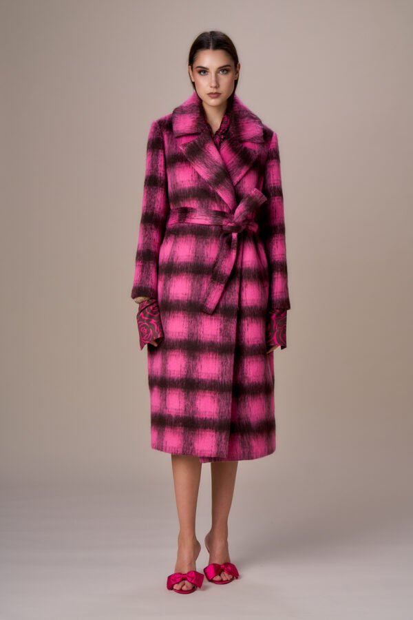 CAPPOTTO LUNGO CON CINTURA BICOLORE ROSA E CIOCCOLATO .