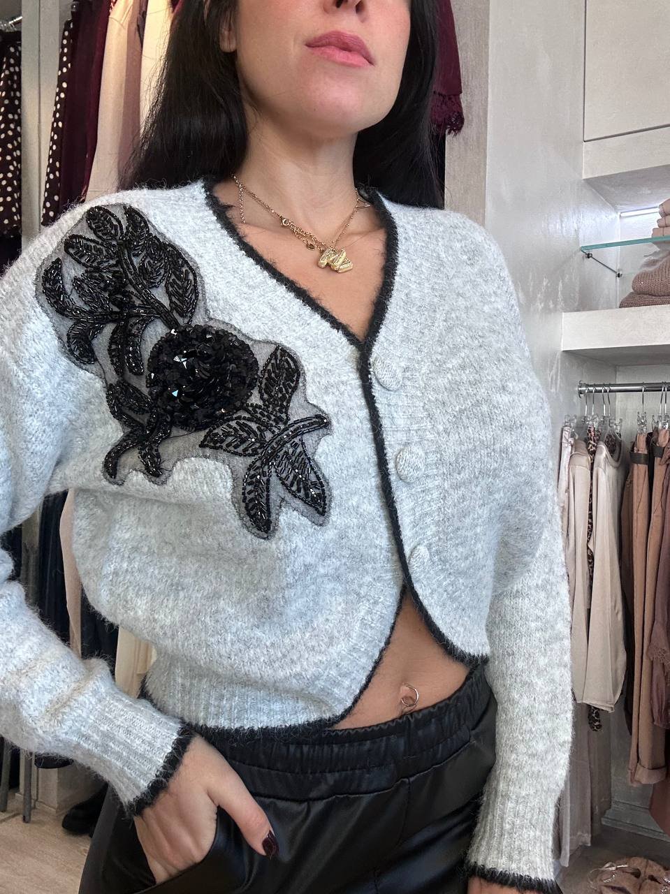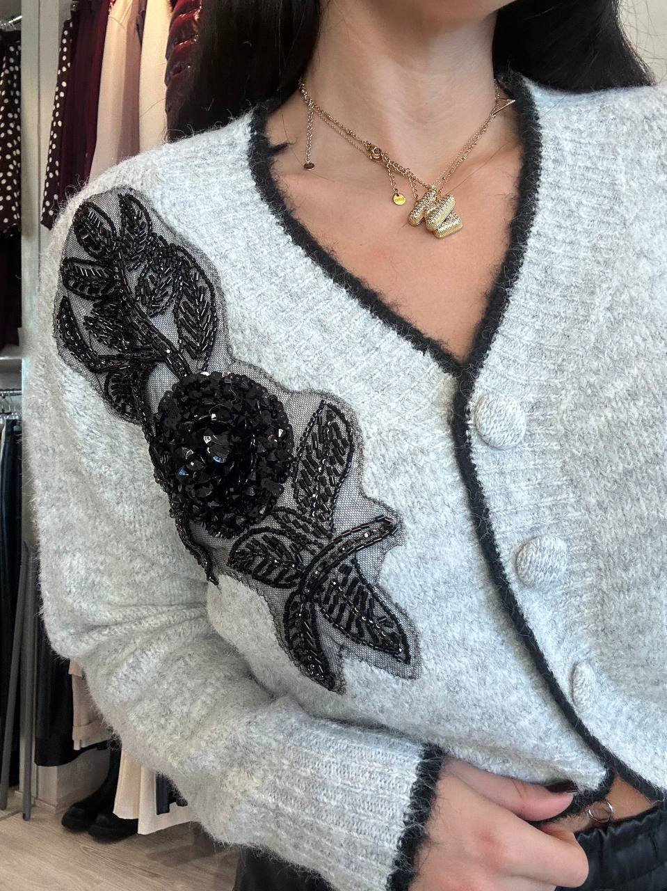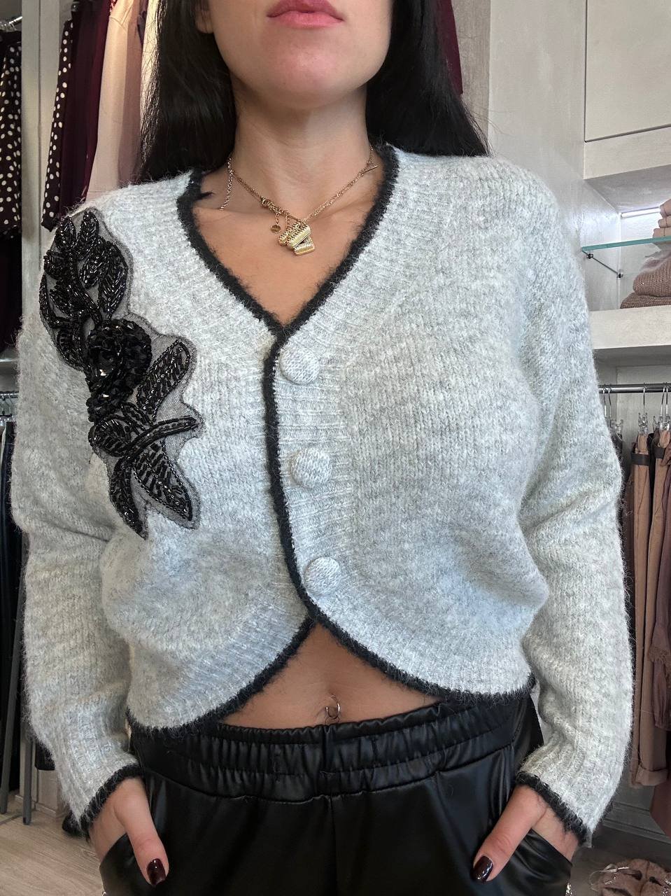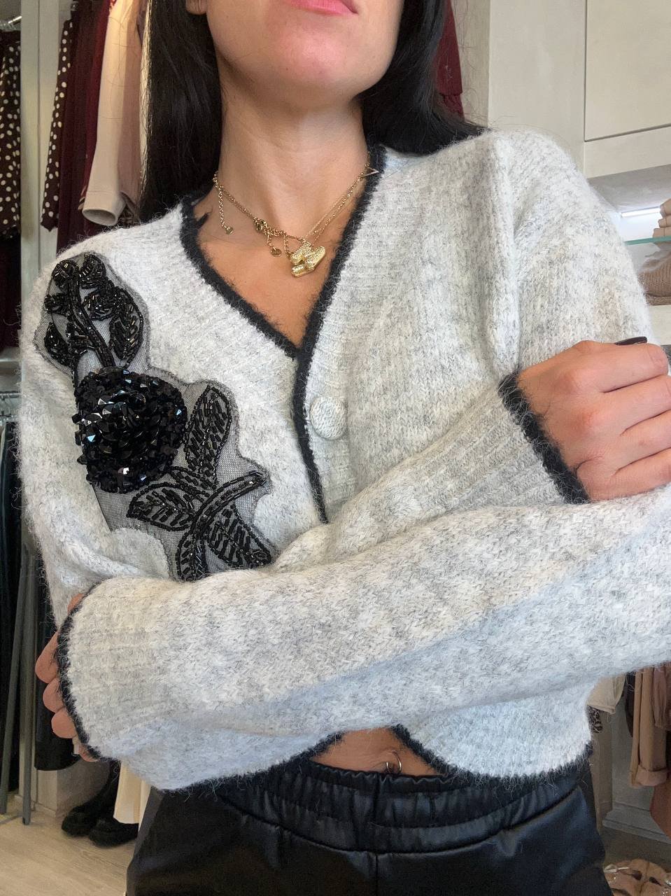 Cardigan tre bottoni, scollo a v. profili neri. applicazione sulla parte sinistra composta da perline e paillettes.