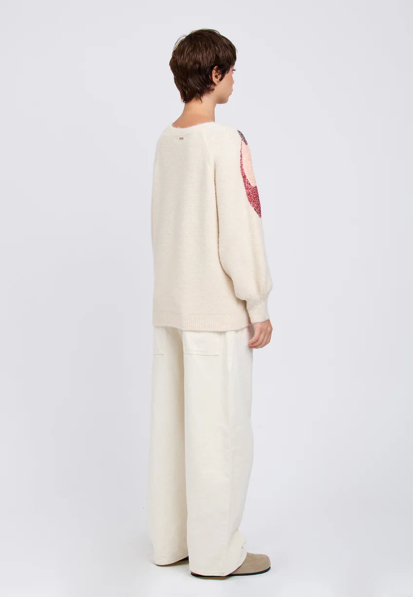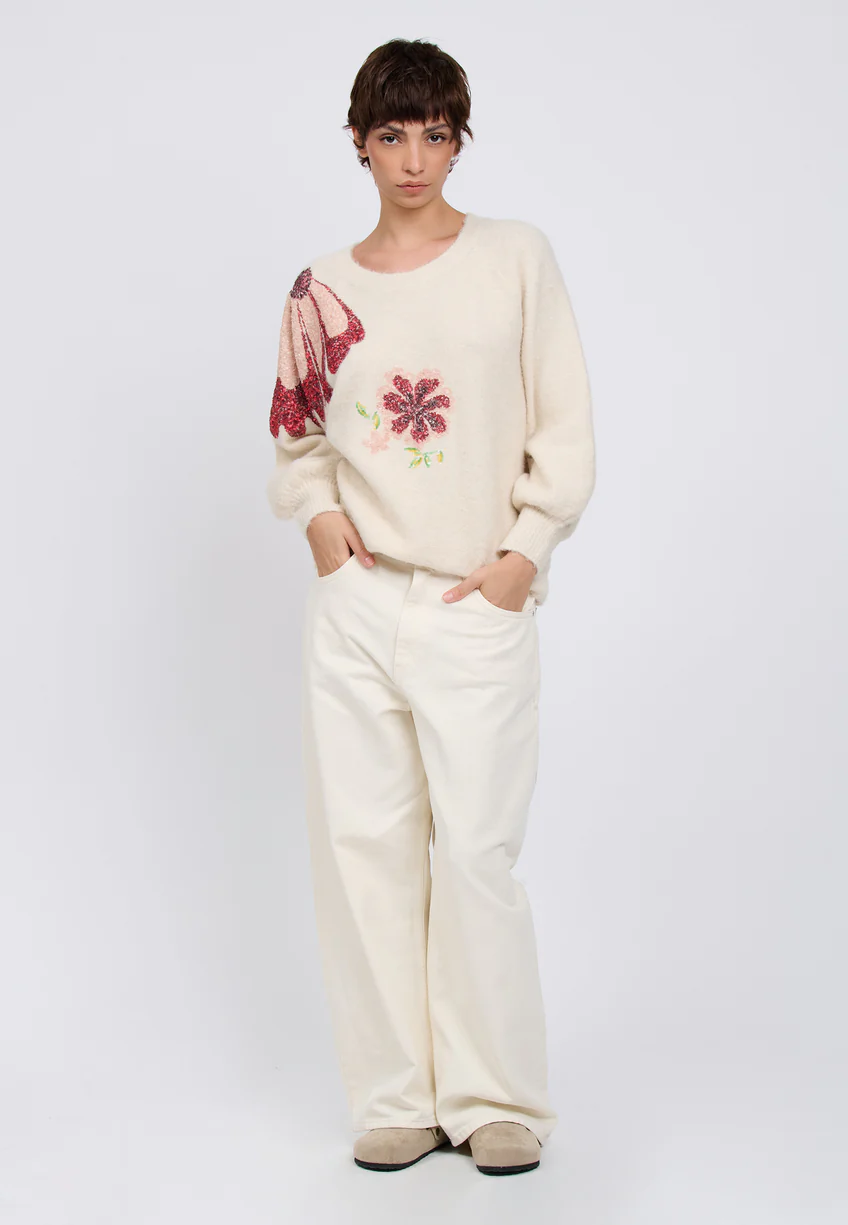 Questa maglia si presenta con una silhouette morbida e soffice e viene esaltata da un dolcissimo ricamo floreale con micropaillettes multicolore. Romantica e retrò-chic, può essere indossata su una gonna maxi in pizzo trasparente e stivali alti per un look da copertina, oppure su un jeans barrel per un look casual-chic.