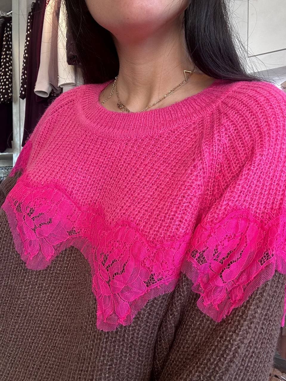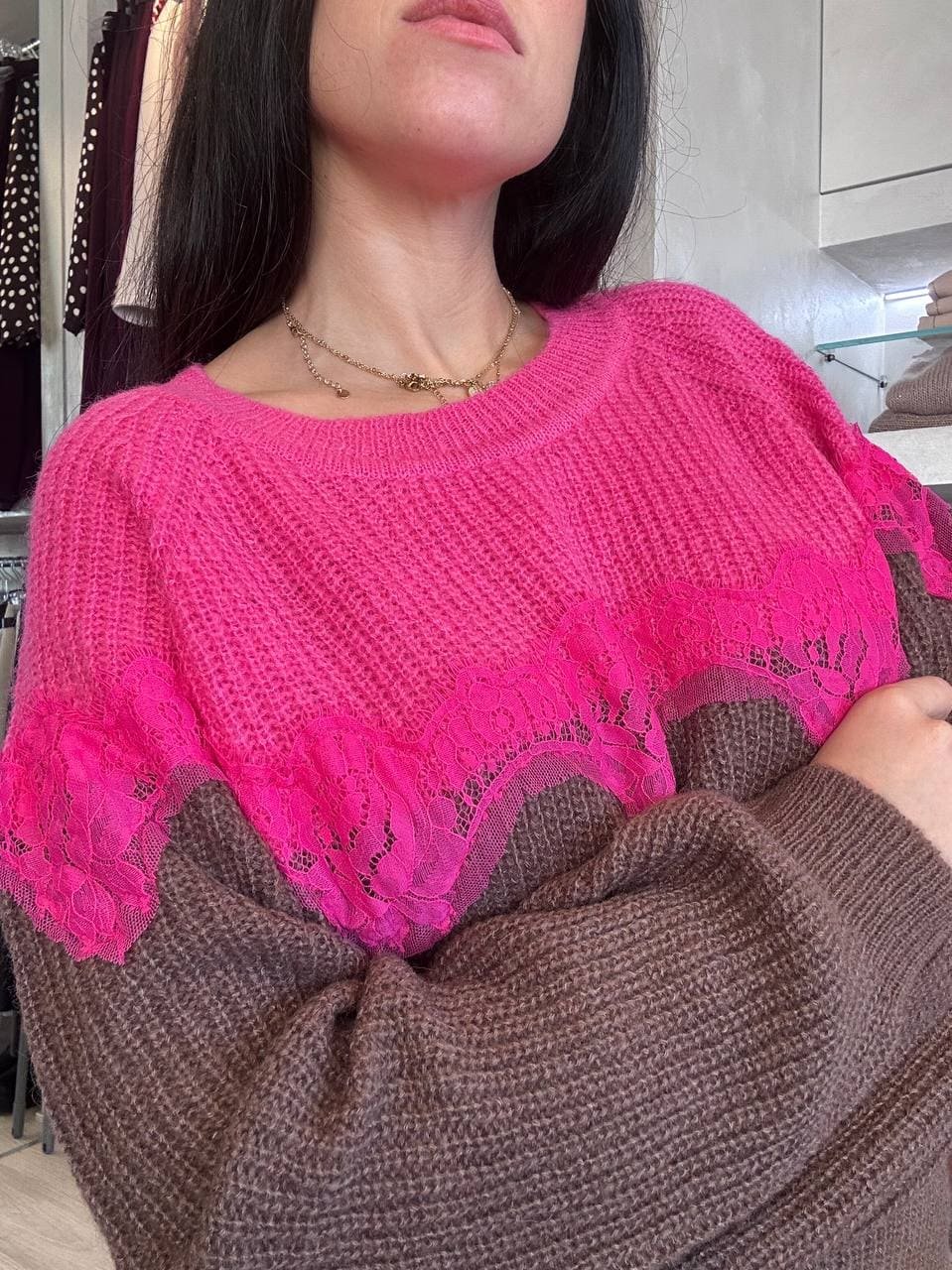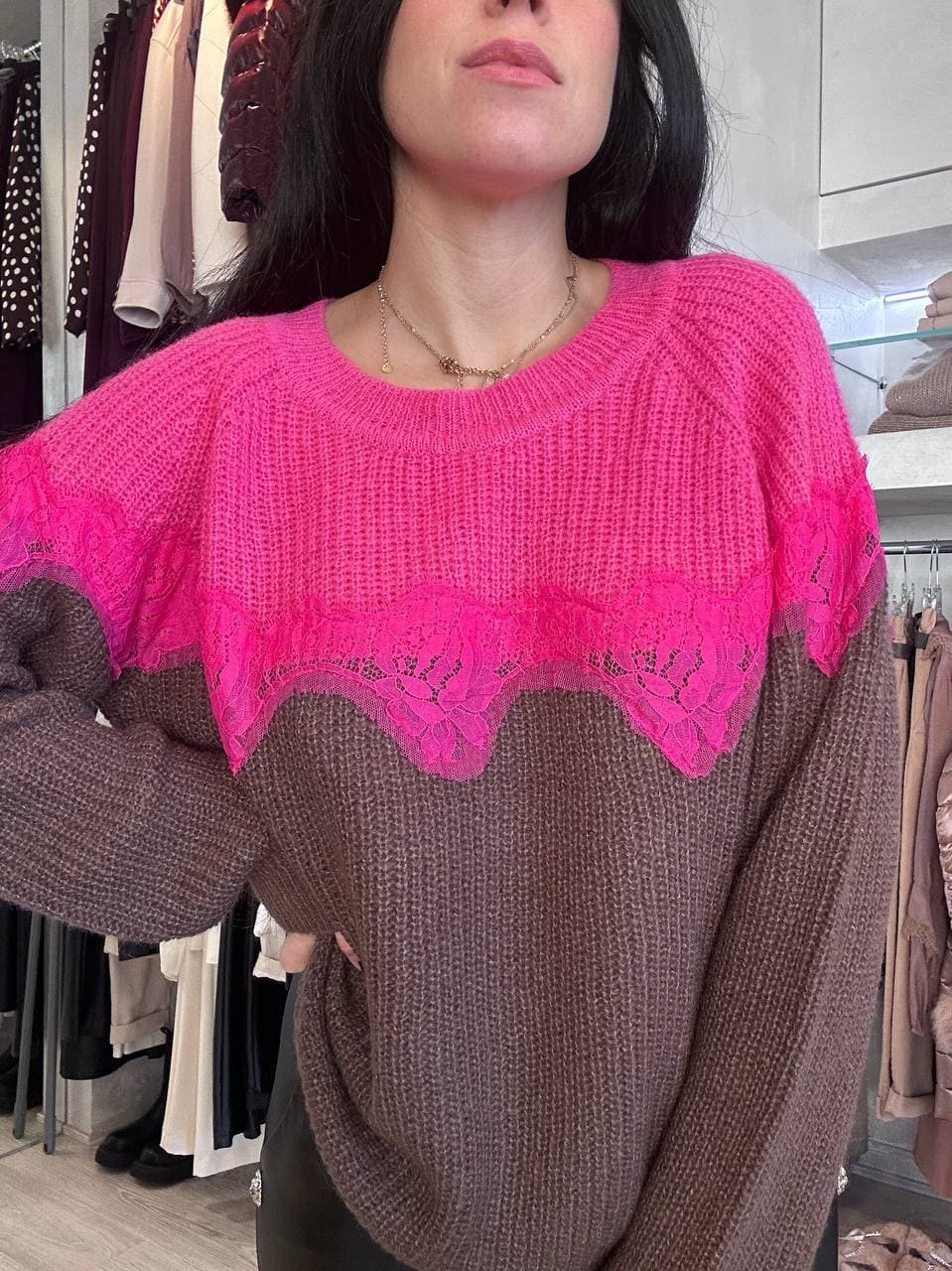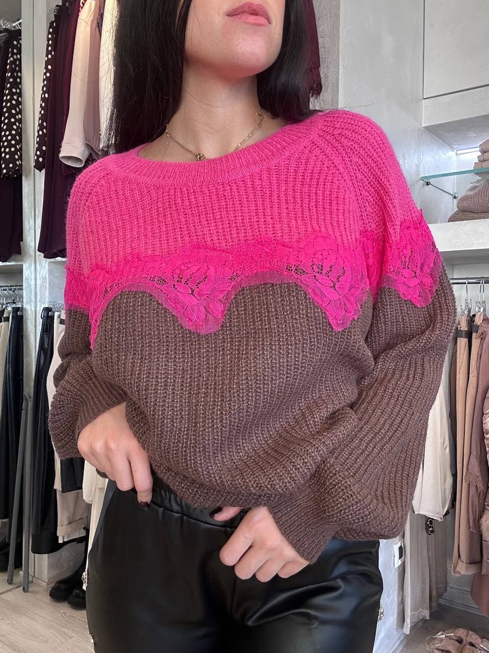 maglia modello morbido a giro collo, a costine. color marrone e fucsia con pizzo.