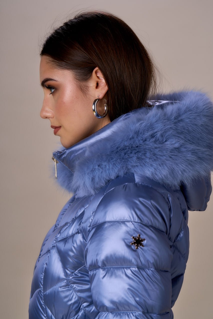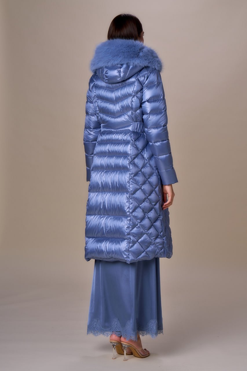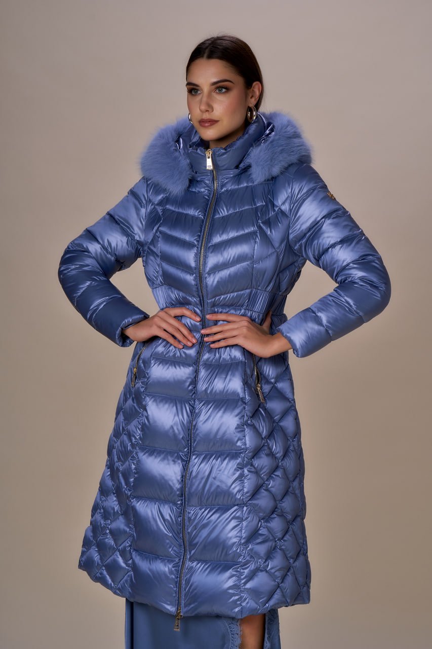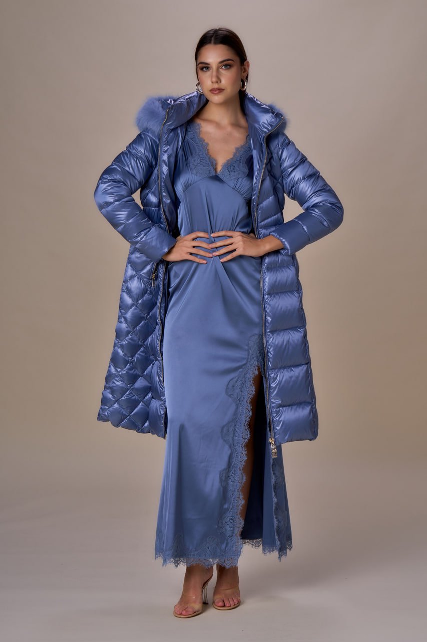 PIUMINO LUNGO AZZURRO . CON CAPPUCCIO CON ECO PELLICCIA . TRAPUNTATO